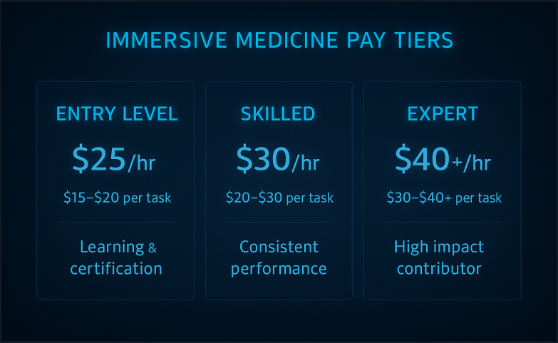 Workers gain access to AI-guided workflows, automated data integration, and task management that reflect real hospital operations. Whether you’re monitoring patient vitals, securing connected devices, or streamlining insurance approvals, Immersive Medicine turns your expertise into measurable outcomes — with compensation tied directly to your skills and performance.